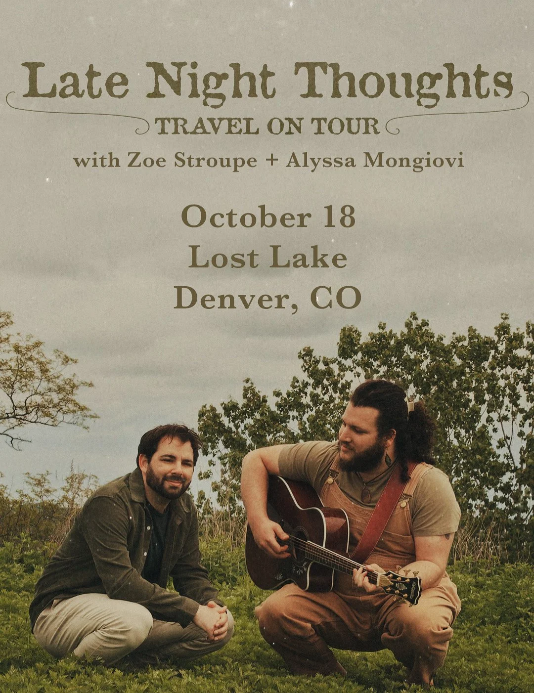 Back to All Events Late Night Thoughts w/ Zoe Stroupe Saturday, October 18, 2025 8:00 PM 10:00 PM Lost Lake Lounge 3602 East Colfax Avenue Denver, CO, 80206 United States (map) Google Calendar ICS